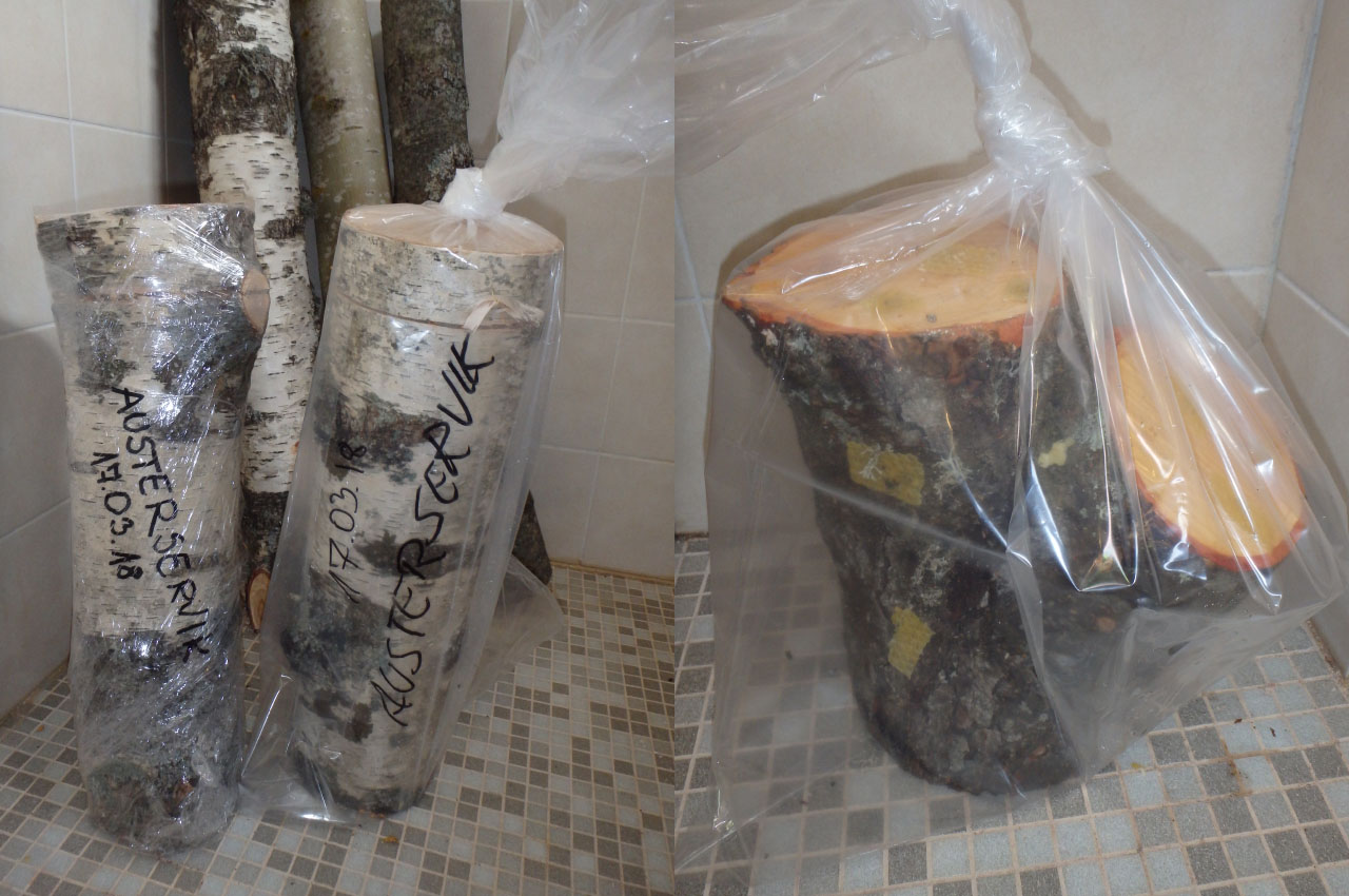 Pakud võib pakkida talvisel ajal kilesse/kilekottidesse, tagades sellega sobiliku mikrokliima, ning stabiilse temperatuuri saavutamiseks viia siseruumi. Nakatatud pakk vajab minimaalset õhuvahetust, selleks peaks kilesse nõelaga kuni 30 imeväikest auku torkama. Ideaalne temperatuur läbikasvamiseks on 20°C, siis võtab see aega 2 kuni 3 kuud. Enne kui nakatatud pakud oma lõplikku asukohta jõuavad, võiks pakk vähemalt 50% valge mütseeliga läbikasvanud olla ning lõhnama meeldivalt seene järele. Ära kasuta kile soojal ajal või kui õhus on looduslikult palju eoseid maist detsembrini.